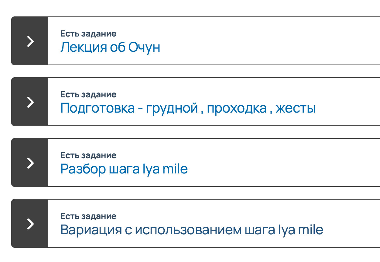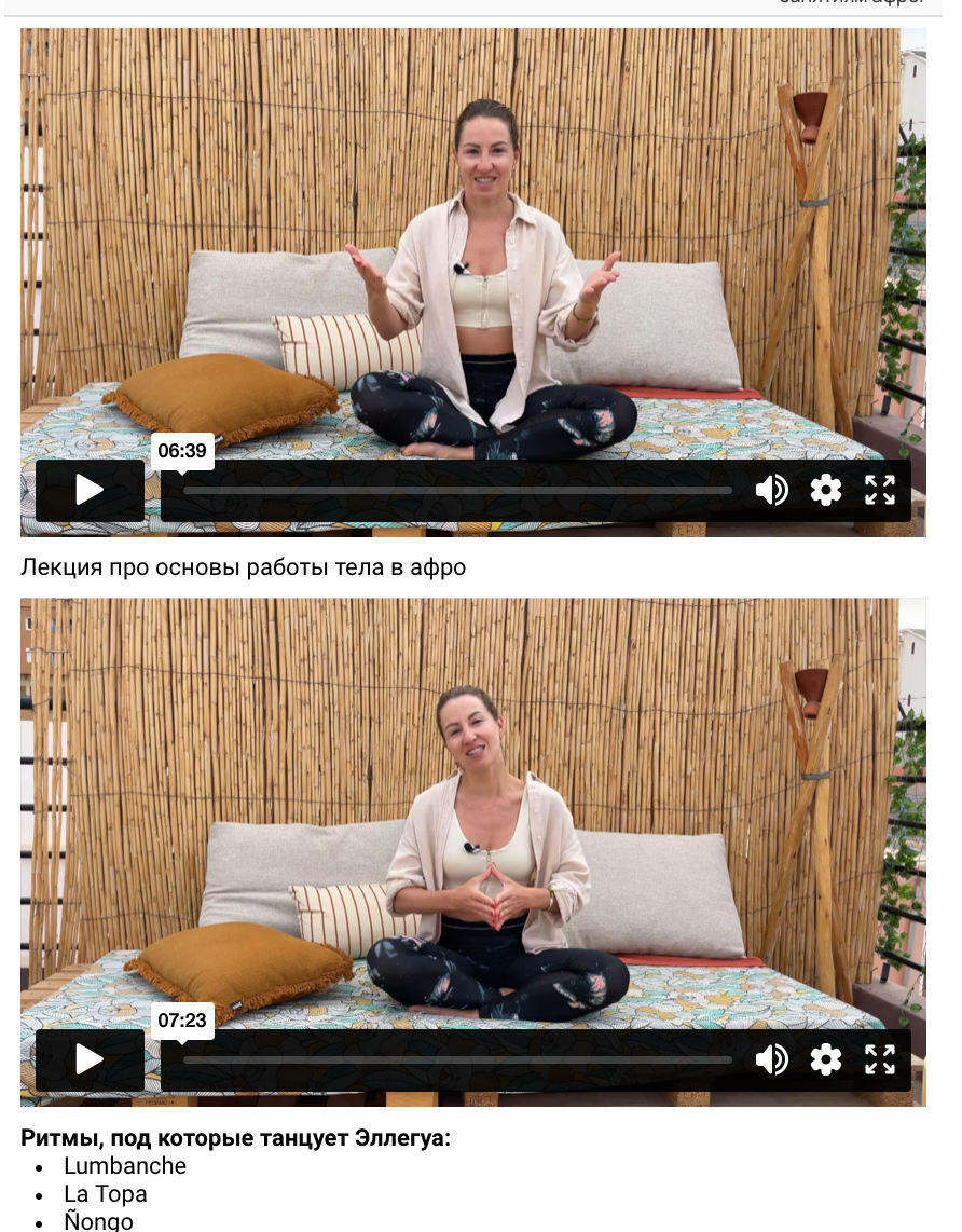 Длительность лекций - 40-60 минут Практическая часть (разбор + отработка с Катериной + отработка под музыку) занимает 20-30 минут , но количество повторений для результата вы подбираете сами
