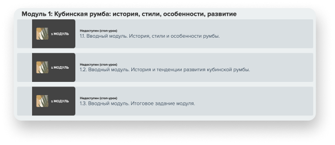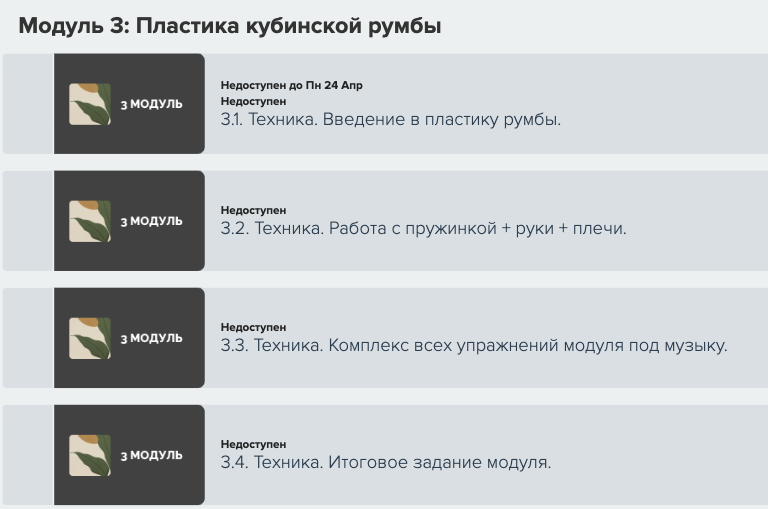 Это было очень глубокое погружение в румбу и в себя. Объем информации и ее систематизация на высшем уровне! Это целая кладезь, которую вы точно не найдете на просторах интернета. Проверку заданий можно сравнить с уровнем университета культуры.Я проходила курс под чутким руководством куратора Олеси,которая мастерски вела меня к новой мне.