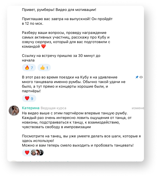 Прошла курс по румбе, это мой второй курс у Катюши! Хочу сказать огромное спасибо, информации много, не только по пластике и хореографии, но также по философии румбы, музыкальности, инструментам румбы и т.д. А самое главное - я стала увереннее в себе, румба помогает раскрыть женственность, сексуальность и показать свои эмоции через танец, это флирт! Девочки, кто сомневается- не сомневайтесь, каждая из курса вынесет что-то своё очень важное. Катины курсы это не только про танцы. Спасибо также всем кураторам за поддержку!